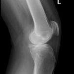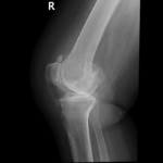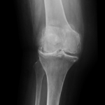 X-rays typically show a narrowing of the joint space in the arthritic knee.