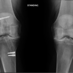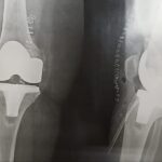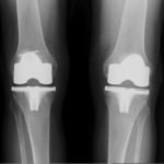 The surgery is performed under spinal or general anesthesia. Your surgeon will make an incision in the skin over the affected knee to expose the knee joint. Then the damaged portions of the femur bone are cut at appropriate angles using specialized jigs. The femoral component is attached to the end of the femur with or without bone cement. The surgeon then cuts or shaves the damaged area of the tibia (shinbone) and the cartilage. This removes the deformed part of the bone and any bony growths, as well as creates a smooth surface on which the implants can be attached. Next, the tibial component is secured to the end of the bone with bone cement or screws. Your surgeon will place a plastic piece called an articular surface between the implants to provide a smooth gliding surface for movement. This plastic insert will support the body’s weight and allow the femur to move over the tibia, similar to the original meniscus cartilage. The femur and the tibia with the new components are then put together to form the new knee joint. To make sure the patella (knee cap) glides smoothly over the new artificial knee, its rear surface is also prepared to receive a plastic component. With all the new components in place, the knee joint is tested through its range of motion. The entire joint is then irrigated and cleaned with a sterile solution. The incision is carefully closed, drains are inserted and a sterile dressing is placed over the incision.